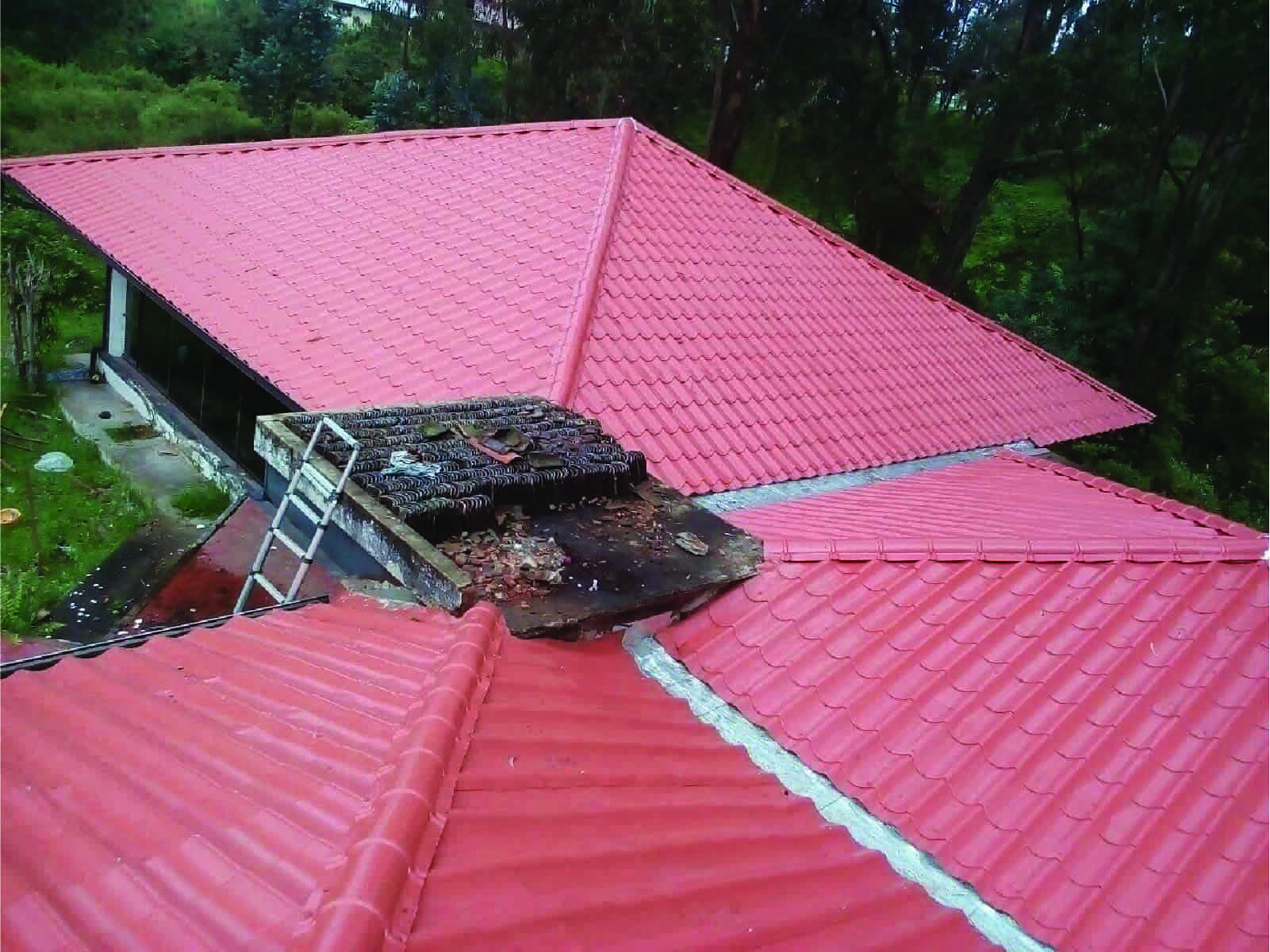 Mantenimiento integral de Fuerte Militar San Jorge, incluye villas de oficiales y bloques de departamentos. Cambio de cubierta galvalumen color terracota en área social.